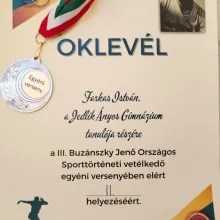 Országos döntő Farkas István, 9.E osztályos tanulónk a Dombóváron megrendezett III. Buzánszky Jenő Országos Sporttörténeti Vetékedőn 2. helyezést ért el. Gratulálunk! Galéria