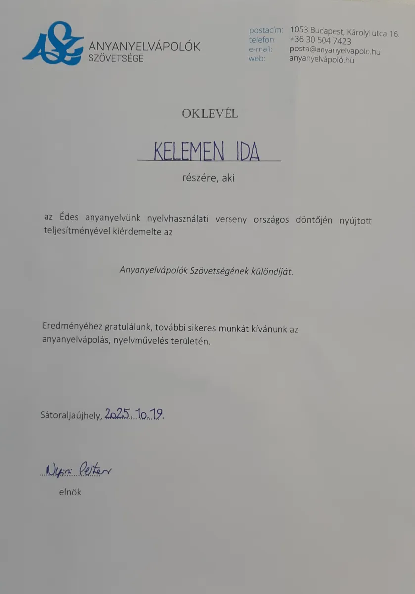 Az 53. Édes anyanyelvünk nyelvhasználati verseny országos döntőjében az írásbeli feladatrészért Kelemen Ida 9.A osztályos tanulónk különdíjban, a szóbeli feladatrészért Kiss-Ferenczi Bíborka 10.A osztályos tanulónk dicséretben részesült.