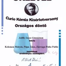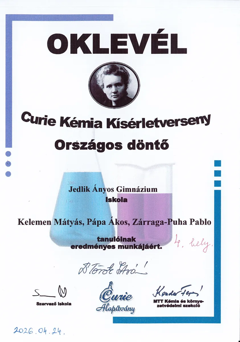 Curie kémia kísérletverseny országos döntőjén Szolnokon csapatunk 4. helyet ért el.