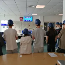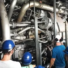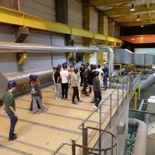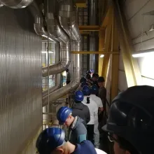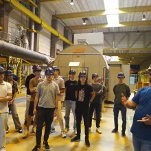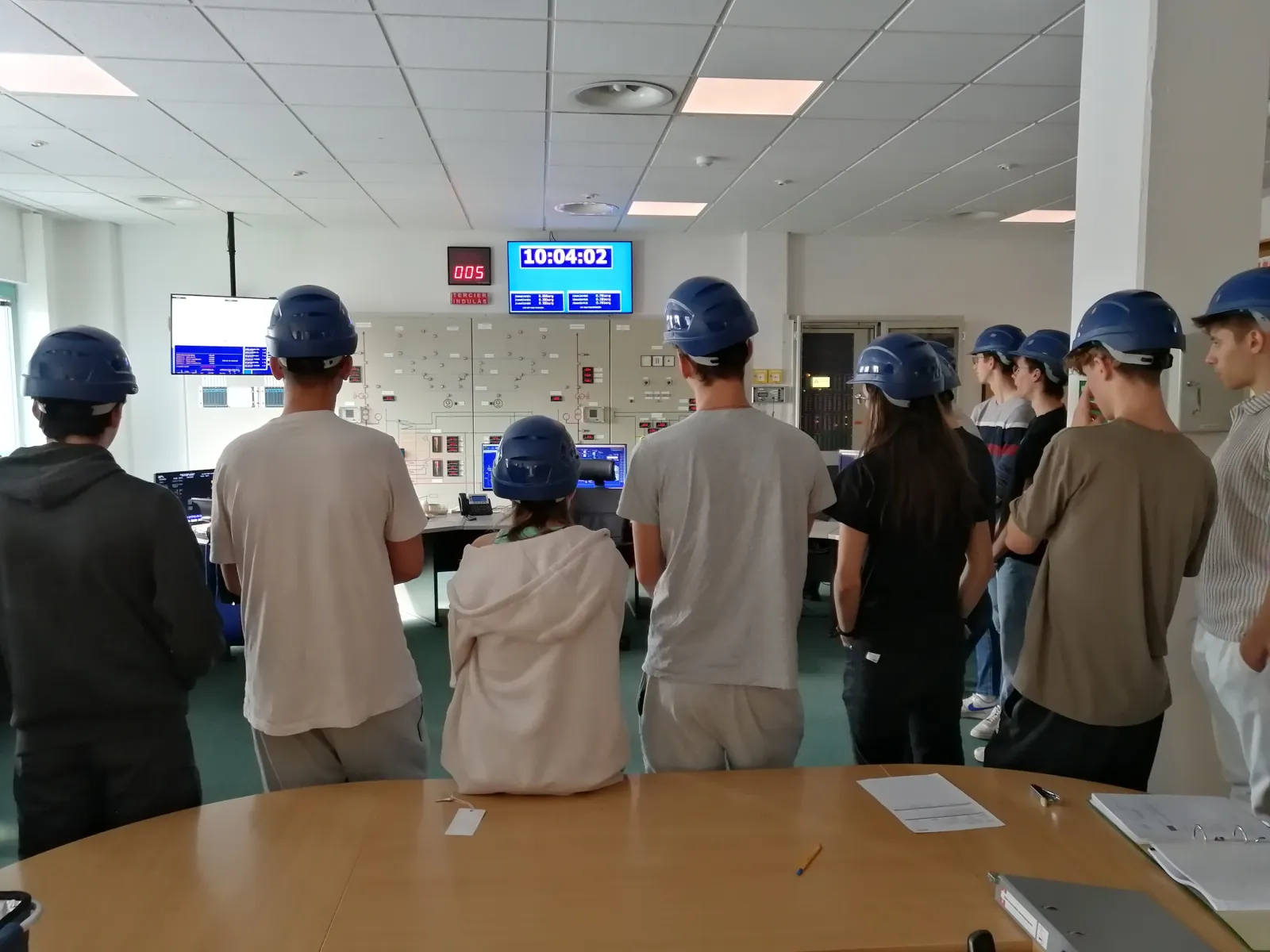 Az előadás után elláttak minket a megfelelő védőfelszerelésekkel (sisakkal és füldugóval), és megkezdtük az erőmű bejárását. Először a vezénylőterem felé vettük az irányt, ahol betekintést nyertünk az erőmű irányítóinak munkájába. Ezt követően végigvezettek az energiatermelés folyamataiban szerepet játszó berendezéseken.