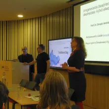 A délelőtti program egy panelbeszélgetéssel zárult, ahol a kutatók Dr. Sándor Judit professzorral (CEU Bioetikai és Jogi központ) közösen vitatták meg a tudományos élet mai kihívásait, etikai és jogi kérdéseit is. A diákok ekkor és a szünetben is kérdezhettek az előadóktól, akik örömmel válaszoltak a felmerülő kérdésekre.