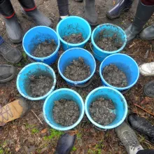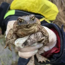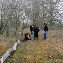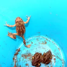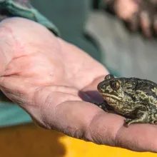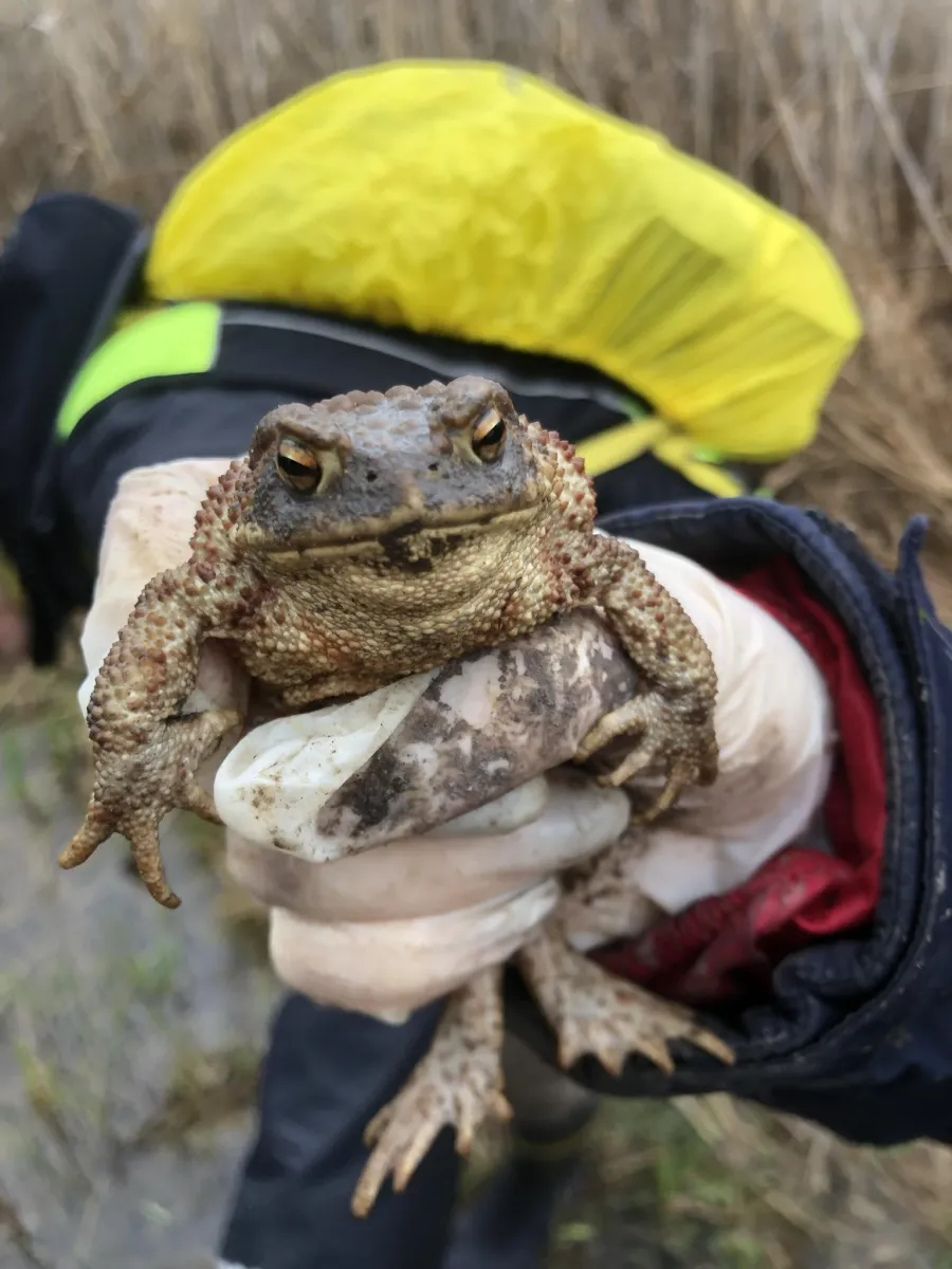 Farmos környékének fő kétéltűje a barna ásóbéka, hazánk egyik legkisebb békafaja. Felismerni márványos mintázatáról és vörös pöttyeiről lehet, de segíti az azonosítást nagy szeme, függőleges állású pupillája és aranyszínű szivárványhártyája is. Az ásóbéka a téli hónapokat a laza talajú, homokos területeken, szántóföldeken tölti, nevéhez méltóan – a hátsó lábán található ásósarkantyú segítségével – akár fél méter mélyre is elrejtve magát. Nos, e cuki faj egyedeit mentettük meg az elgázolás elől - nehogy egyik dimenziójukat elveszítsék vándorlás közben. A mentés során a terelőkerítés mellett földbe ásott 105 db vödörből gyűjtöttük össze a békákat, eközben feljegyzésre került az egyedek száma faj és vödörszám szerint. A pontos statisztika célja, hogy a nemzeti park munkatársai (5 méteres területfelbontásban) évről évre elemezni tudják a populációk egyedszámának változását, Farmoson ugyanis már 20 esztendeje zajlik békamentés. Az éves gyakoriságú monitoring során a szakemberek képet kaphatnak a kétéltű-populációkat veszélyeztető hatásokról, így pedig hatékonyabban tudnak ezek ellen fellépni.