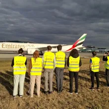 Ezután következett a reptérbejárás, ám mielőtt beléphettünk volna az utasoktól elzárt területre, egy szigorú biztonsági ellenőrzésen kellett átesnünk. A busz ezután körbevitt minket az utasoktól elzárt területen, miközben kísérőnk részletesen elmagyarázott minden történést, ami az utasok számára általában rejtve marad. Több helyen kiszállva csodáltuk meg a repülőgépeket: a futópálya végén például a fejünk felett néhány tíz méterre szálltak le a gépek! Olyan közel voltak, hogy egy perccel később éreztük és hallottuk is a szárnyak által keltett légörvényeket. A kedvünkért egy rövid időre még a futófényeket is felkapcsolták – ezek rossz látási körülmények között segítik a pilótákat a leszállás során.