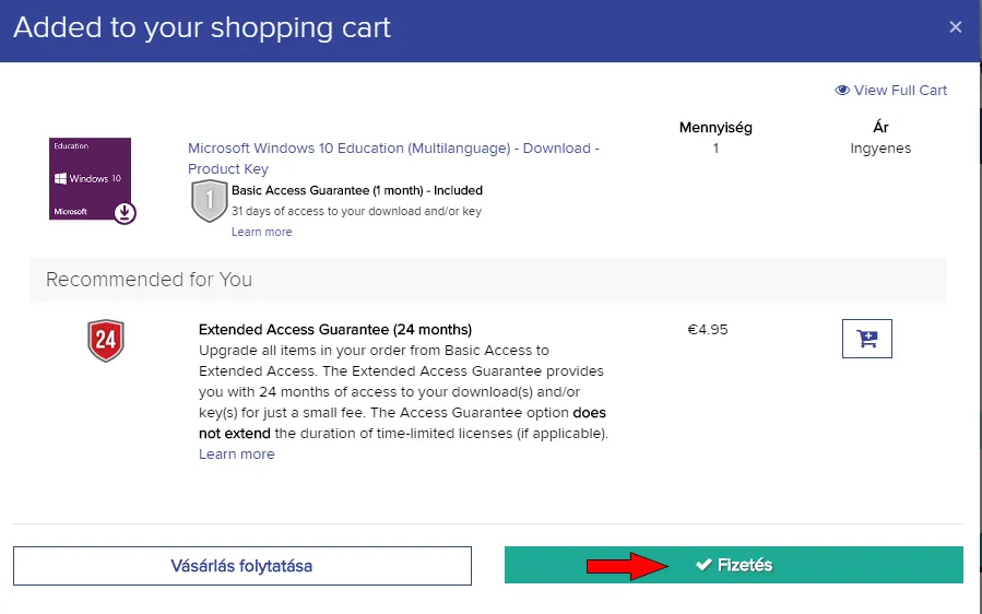 4. lépés: Az alábbi képernyőn kattints az első Felvétel a kosárba gombra! (A második opció a Windows egy másik verziójára vonatkozik, ami nem tartalmaz bizonyos funkciókat.)